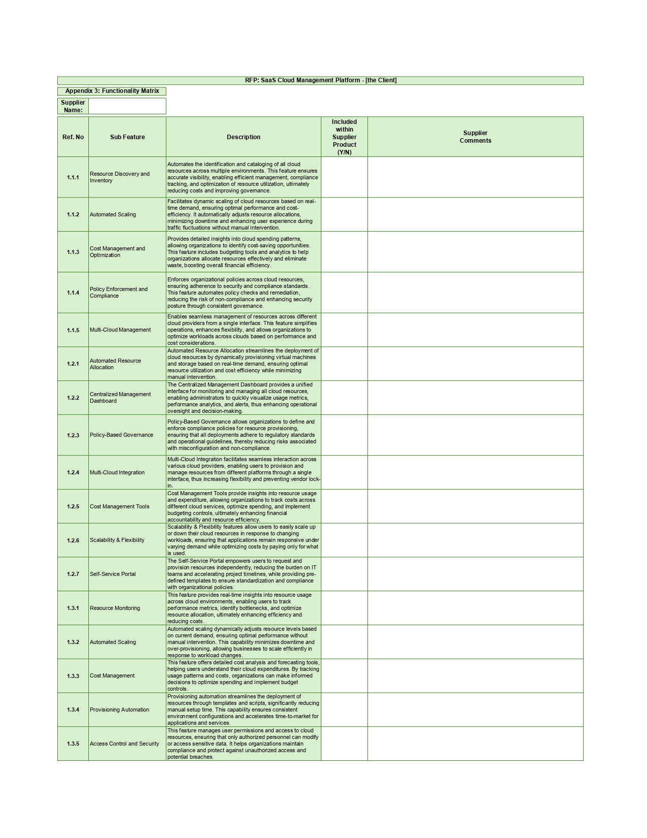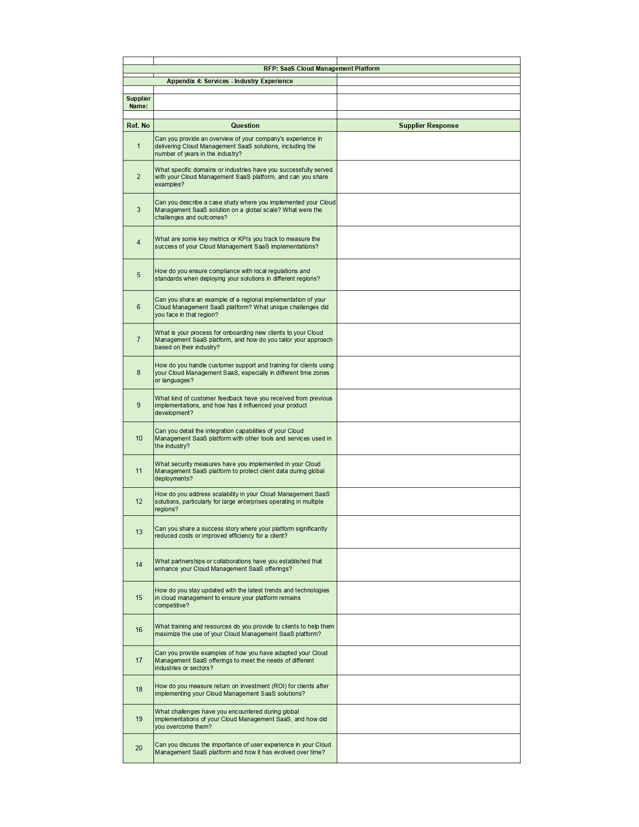 Our SaaS Cloud Management Platform RFP Template includes all the core documents needed to conduct a thorough and streamlined selection process: